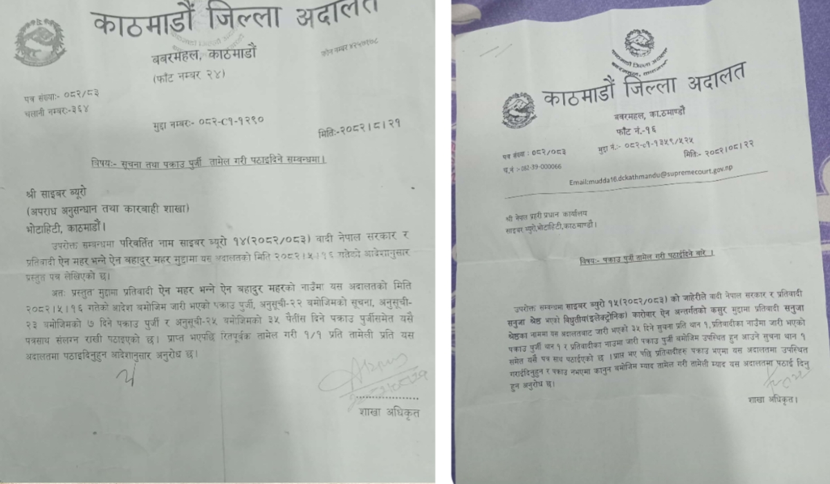 महरदम्पतीविरुद्ध रश्मिला धामीले विद्युतीय करोबार ऐन, ०६३ को दफा ४७ अन्तर्गतको कसुरमा साइबर ब्युरोमा जाहेरी दिएकी थिइन्।