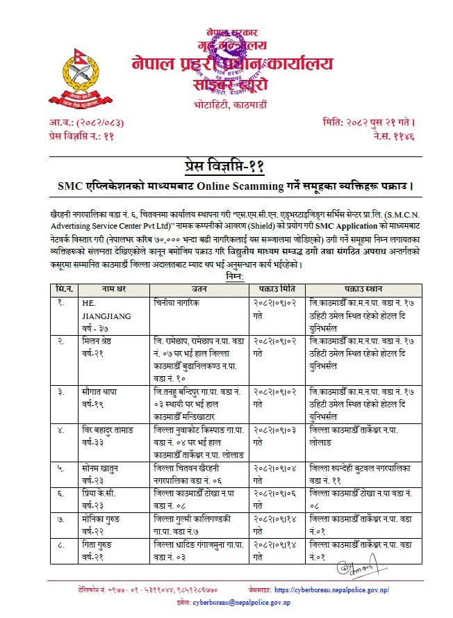 चितवनको खैरहनीमा ‘एस.एम.सी.एन. एड्भरटाइजिङ सर्भिस सेन्टर’ नामक कार्यालय खोलेर ‘SMC’ नामक मोबाइल एपमार्फत् उनीहरूले विभिन्न प्रलोभनमा पारी स्क्याम गर्ने गरेको एसपी दीपकराज अवस्थीले बताए ।